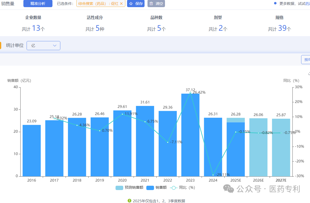 市场规模与波动:根据最新销售数据,促红素类药品的年销售额在2023年达到峰值37.12亿元,同比增长26.42%。然而,2024年销售额骤降至26.31亿元,同比下滑29.11%。这表明,传统短效EPO市场已触及天花板,价格压力与竞争白热化并存。