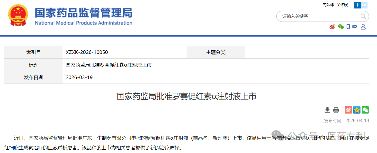近日,国家药品监督管理局批准广东三生制药有限公司申报的罗赛促红素α注射液(商品名:新比澳)上市,该品种用于治疗因慢性肾脏病引起的贫血,且正在接受促红细胞生成素治疗的血液透析患者。该品种的上市为相关患者提供了新的治疗选择。